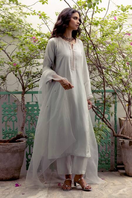 Grey kurta with geometric embroidery around neckline & sleeves hem. Comes with pant, dupatta & separate slip.