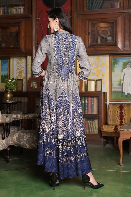 Blue Rayon Embellished Royal Palace Pattern And Stone Work Notched Round Dress