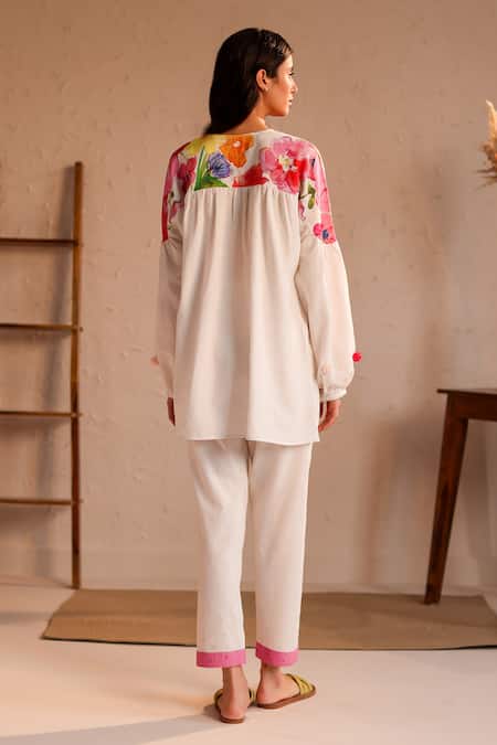 Ivory Linen Water Color Florals V Neck Amalfi Pattern Tunic