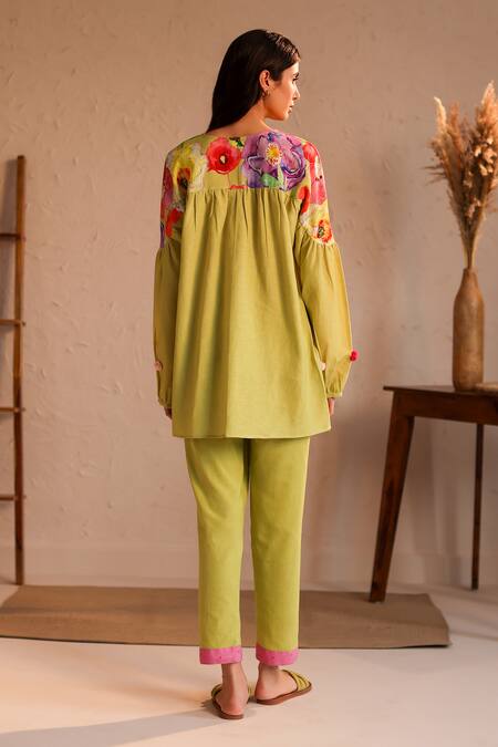 Lime green tunic featuring water color floral pattern yoke and pleated fall