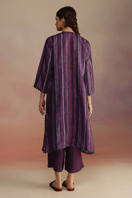 Buy_Roza_Purple Silk Round Neck Hand Sketched Stripe Kurta Set