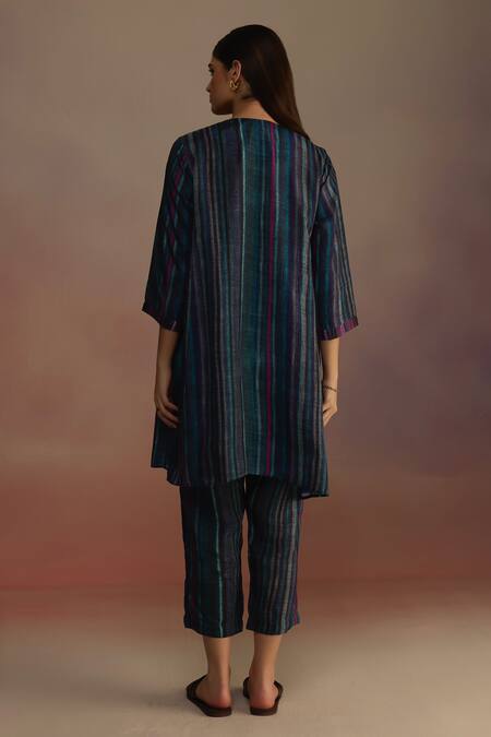 Buy_Roza_Blue Habutai Silk Printed Stripe Round A-line Kurta_at_Aza_Fashions