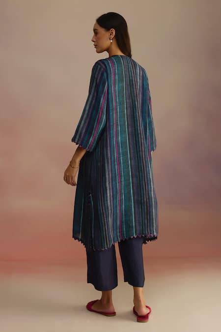 Shop_Roza_Blue Habutai Silk Printed Stripe Round Hand Sketched Kurta Set_at_Aza_Fashions