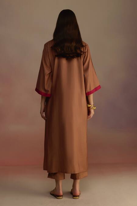 Shop_Roza_Brown Silk, Wool V-neck Floral Hand-drawn Kurta Set_Online_at_Aza_Fashions