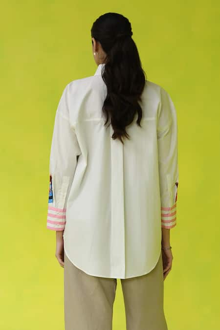Ivory oversized shirt in poplin fabric featuring colorful artistic prints on the front and sleeves