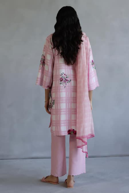 Pink stole featuring a checkered floral print with a contrast tassel border