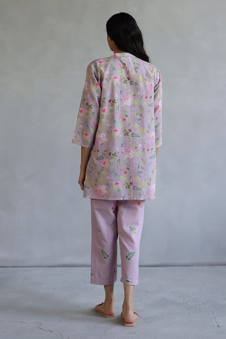 Pink kurta featuring hyacinth floral print and contrast stitchline thread embroidered neckline. Paired with straight pants showcasing a similar floral pattern.