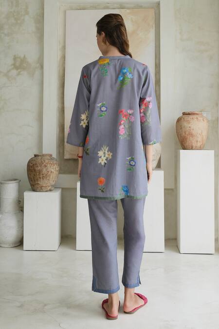Purple Linen Print Marigold V Collar Floral Short Tunic With Pant