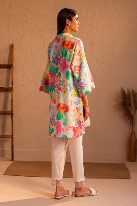 Multi color linen kaftan featuring watercolor floral prints and a collared neck