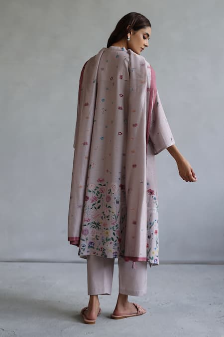 Pink Linen V-neck Botanical Print Kurta And Pant Set