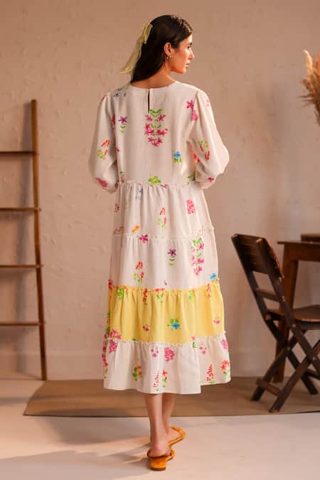 Buy_Roza_Ivory Linen Embroidery Round Neck Tuscany Tiered Floral Print Dress _Online_at_Aza_Fashions