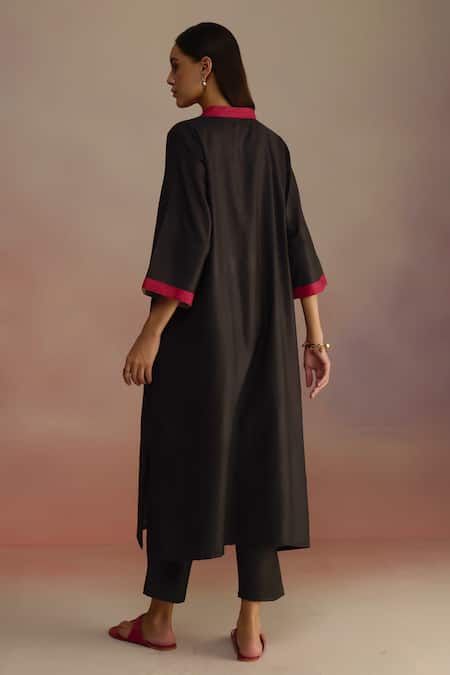 Buy_Roza_Black Silk, Wool Embroidery V-neck Floral Hand-drawn Kurta Set_Online_at_Aza_Fashions