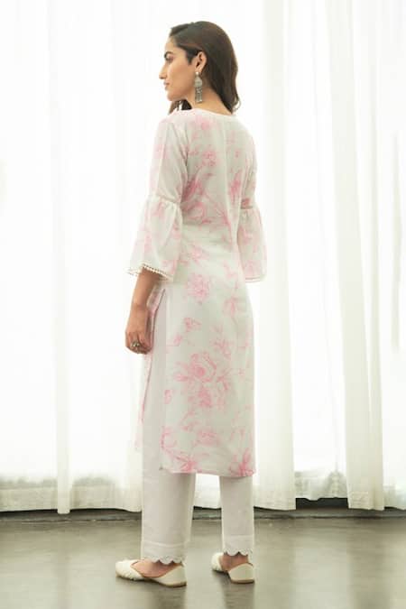 Off-white cotton kurta with floral print pattern & bell sleeve detailing. Paired with pant.