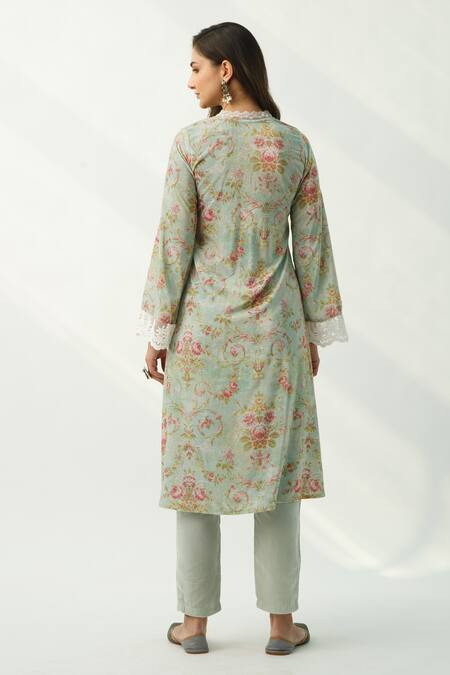 Green 100% Velvet Floral Print V Neck Fiza Kurta