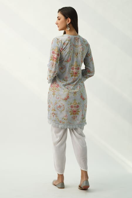 Blue velvet floral print kurta with lace work. Paired with off white tulip pant.