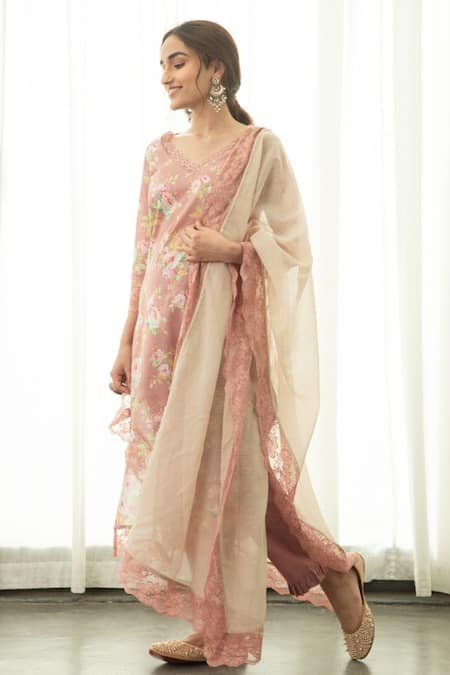 Peach cotton floral print kurta with lace work detail. Paired with frill hem pant and dupatta.
