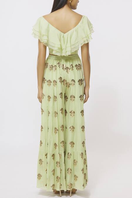 Mint palazzo with embellished motif all over & ruffle crop top.