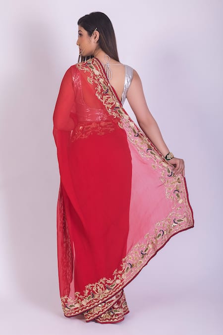 Red chiffon saree with peacock motif in multiple types of embroidered border. Comes with blouse.