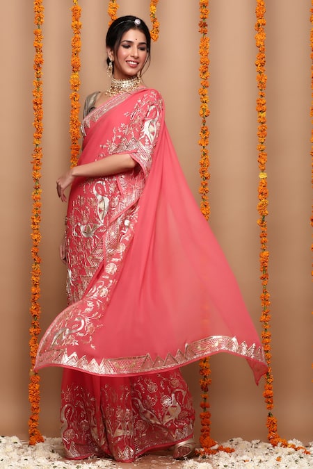 Pink saree highlighted with aari-sequin geometric-bird hand embroidery. Comes with blouse.