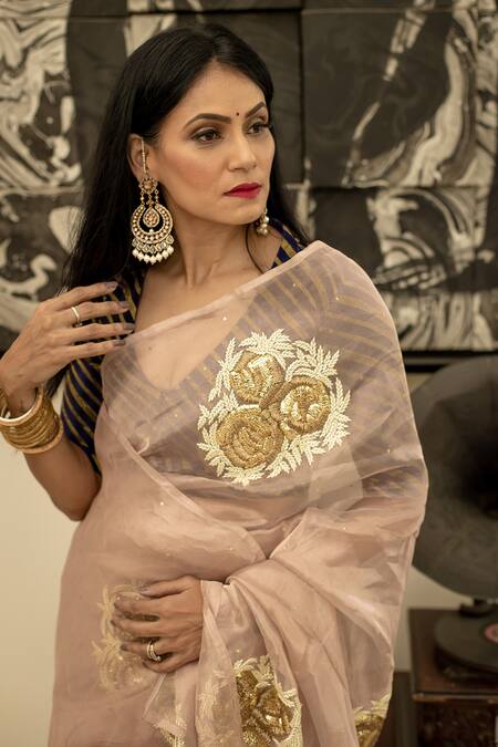 Buy_Ruar India_Gold Chiffon Pearls Rose Embroidered Saree With Blouse _Online_at_Aza_Fashions