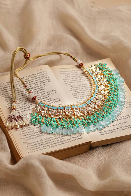 Gold plated choker necklace embellished with kundan, pearls, and green beaded hand detailing