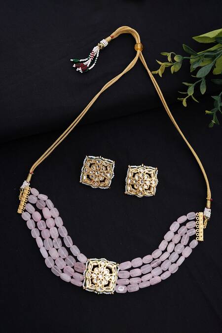 Pink Beads, Diamonds And Kundan Hand Work Choker Necklace Set