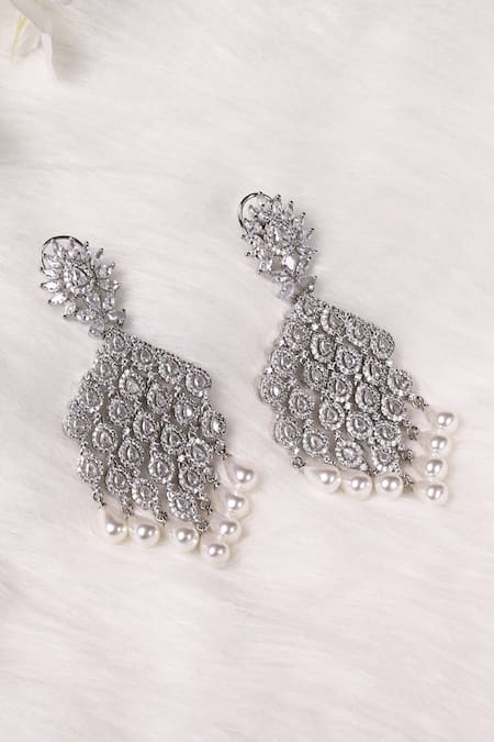 Silver chandelier earrings featuring intricate diamond embellishments and pearl danglers