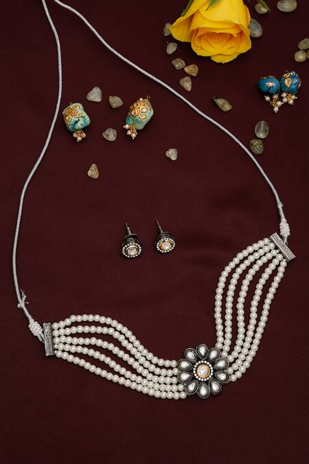 Buy_Ruby Raang_Gold Plated Pearls, Diamonds Floral Kundan Choker Set_Online_at_Aza_Fashions