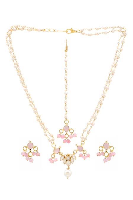 Pink Stones, Beads, Pearls Gold Plated Kundan Jewellery Set
