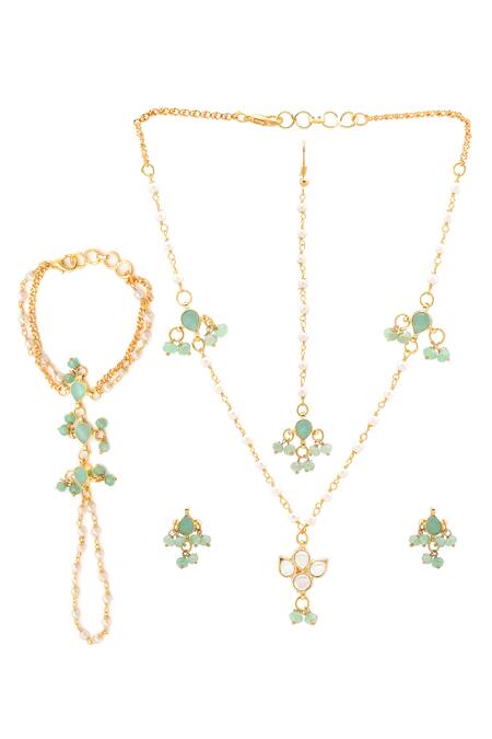 Green gold plated jewellery set featuring a necklace, earrings, maangtikka, and haathphool. The set is made from brass and adorned with Polki Kundan, semi-precious beads, and pearls.