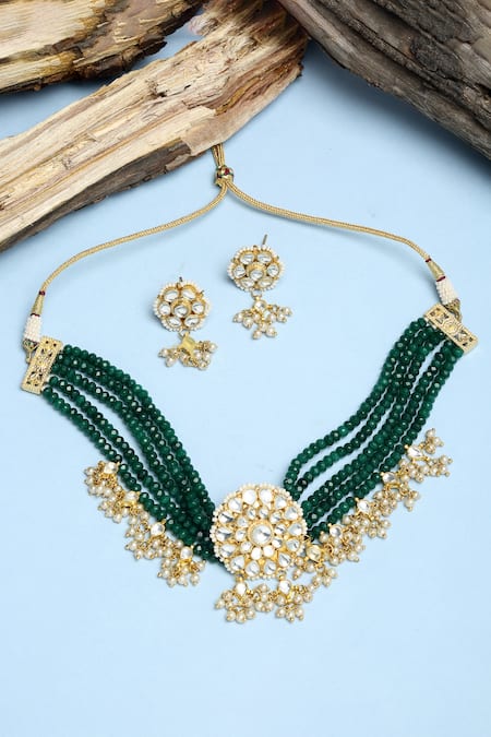 Green Diamonds, Pearls Kundan And Beads Embellished Necklace Set