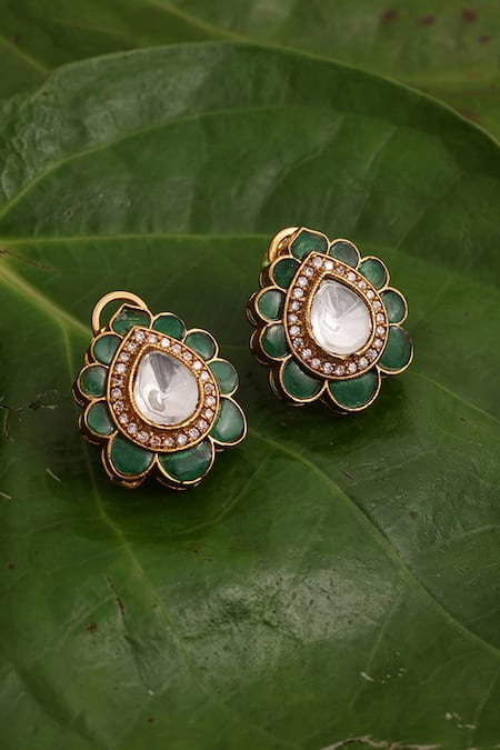 Green teardrop stud earrings featuring kundan and stone embellishments
