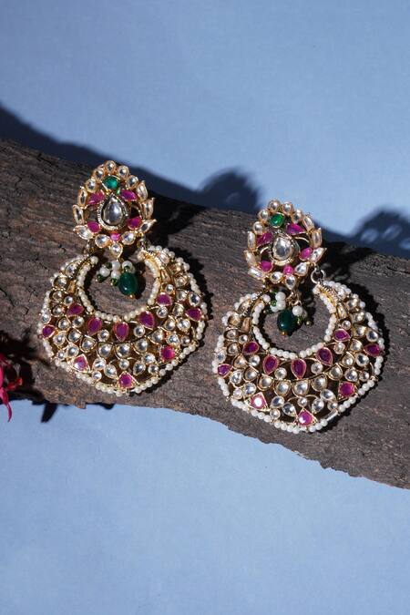 Gold toned chandbali earrings featuring intricate kundan and pearl embellishments