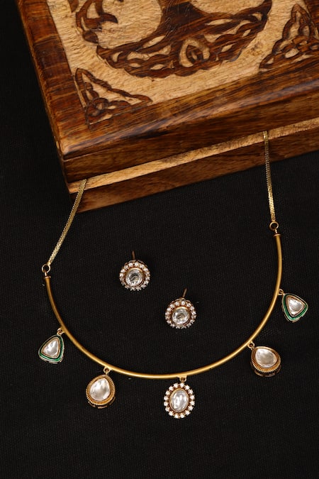 Gold tone hasli chain necklace embellished with clear kundan, polki, and semi-precious stones in a drop pattern. Paired with a matching pair of earrings featuring similar embellishments.