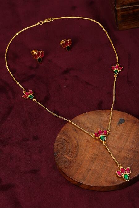 Buy_Ruby Raang_Multi Color Diamonds, Stones Lotus Kundan Embellished Lariat Chain Necklace Set_Online_at_Aza_Fashions