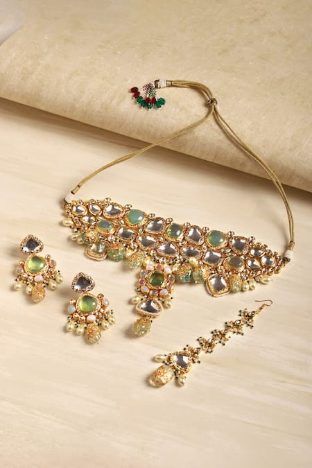 Geometric carved motifs on choker, Kundan and stone embellishments, Bead detailing on earrings