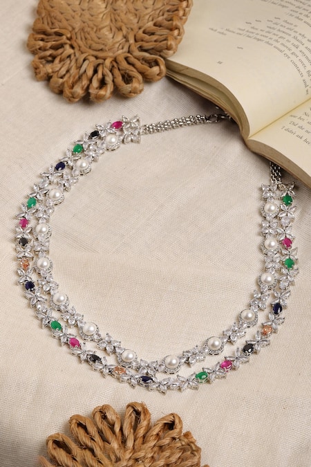 Double layered design with a mix of colorful stones and pearls., Intricate floral motifs enhancing the overall appeal.