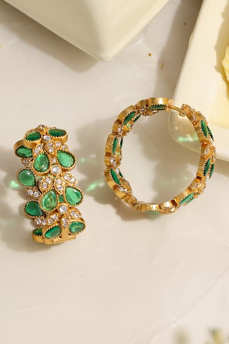 Intricate hand embroidery with brass detailing, Unique green stone embellishments, Elegant design suitable for various occasions