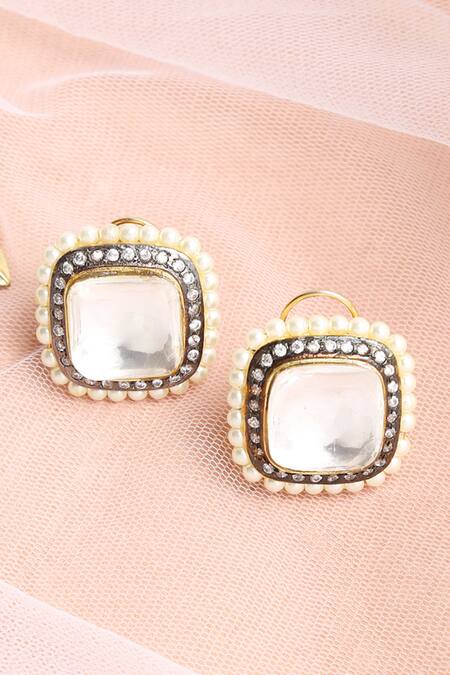 Silver toned geometric carved stud earrings featuring kundan and pearl embellishments