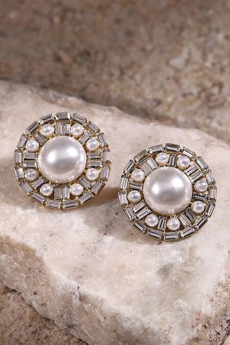 Gold tone circular studs featuring pearl embellishments and stone accents