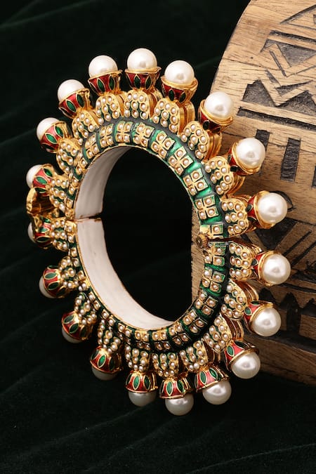 Gold toned bangle featuring oversized pearls and multicolored meenakari work
