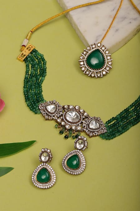 Buy_Ruby Raang_Green Pearls, Stones Polki Onyx Embellished Choker Set