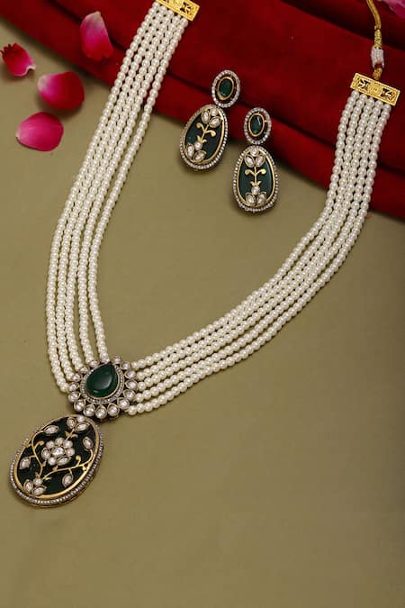 Buy_Ruby Raang_Green Pearls, Pom-poms, Stones Embellished Pendant Necklace Set _Online_at_Aza_Fashions