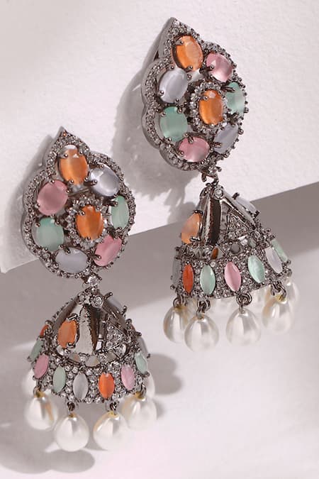 Multi color stone embellished tear drop carved jhumkas featuring a dangling design