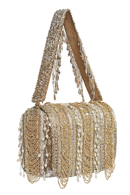 Gold and silver flapover clutch featuring hand embroidery with Japanese micro beads, baroque pearls, and ornamental tassels