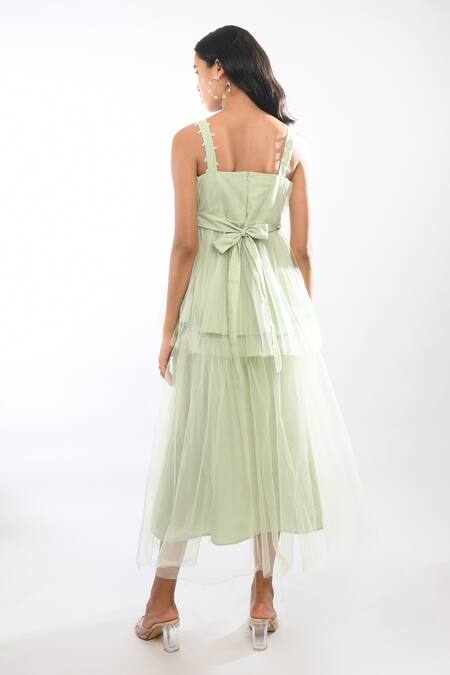 Green Net, Lining Crepe Square Neck Ruched Top And Pleated Skirt Set