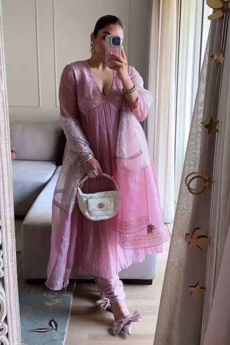 Lilac A-line kurta featuring chintz floral print with zardozi and mukaish embroidery. Paired with a tassel bordered dupatta and churidar.