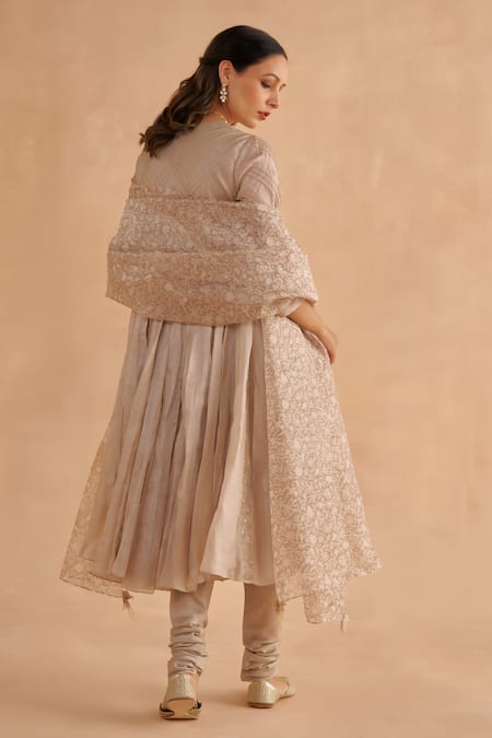 Warm grey anarkali featuring floral hand embroidery and zardozi work. Paired with a churidar and a dupatta, this set is crafted from chanderi and paper tussar fabrics.