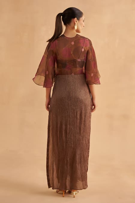 Brown crushed silk tunic featuring a V neck and flared sleeves with lotus motif print. Paired with matching crushed silk pants and an inner bustier adorned with abstract hand embroidery.