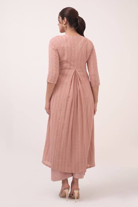 Pastel pink kurta featuring intricate embroidery on the neckline and a button-down front. Paired with coordinating pastel pink wide-leg pants.